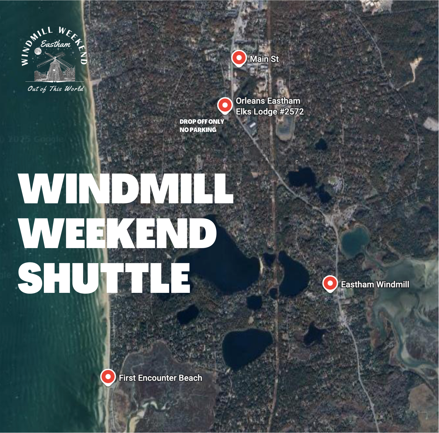 Most events will be located on the Windmill Green across from Town Hall. Parking at the Windmill Green is very limited. Shuttle Services are available Saturday from 10:00 am to 4:00 pm. Loops from First Encounter Beach run 10-4. Loops from the Elks Lodge run 10-2.